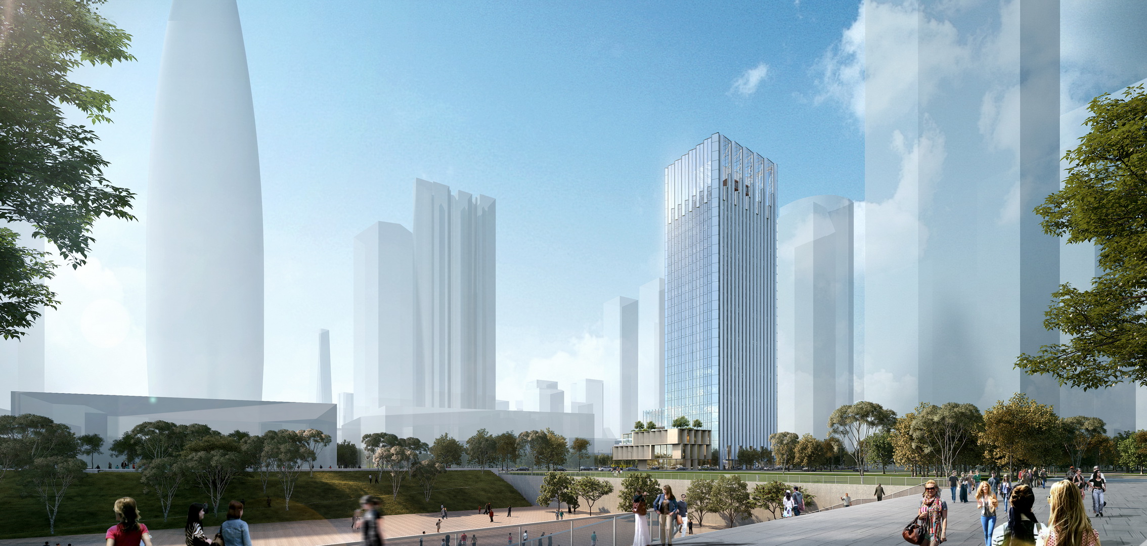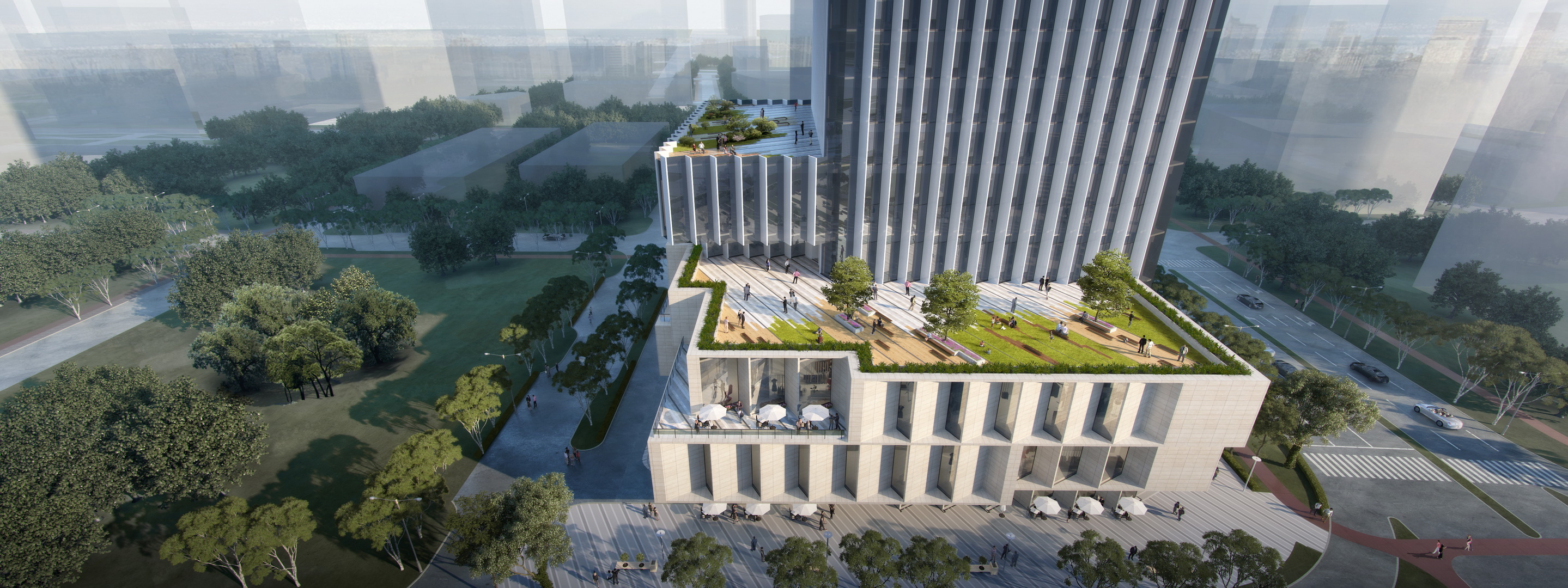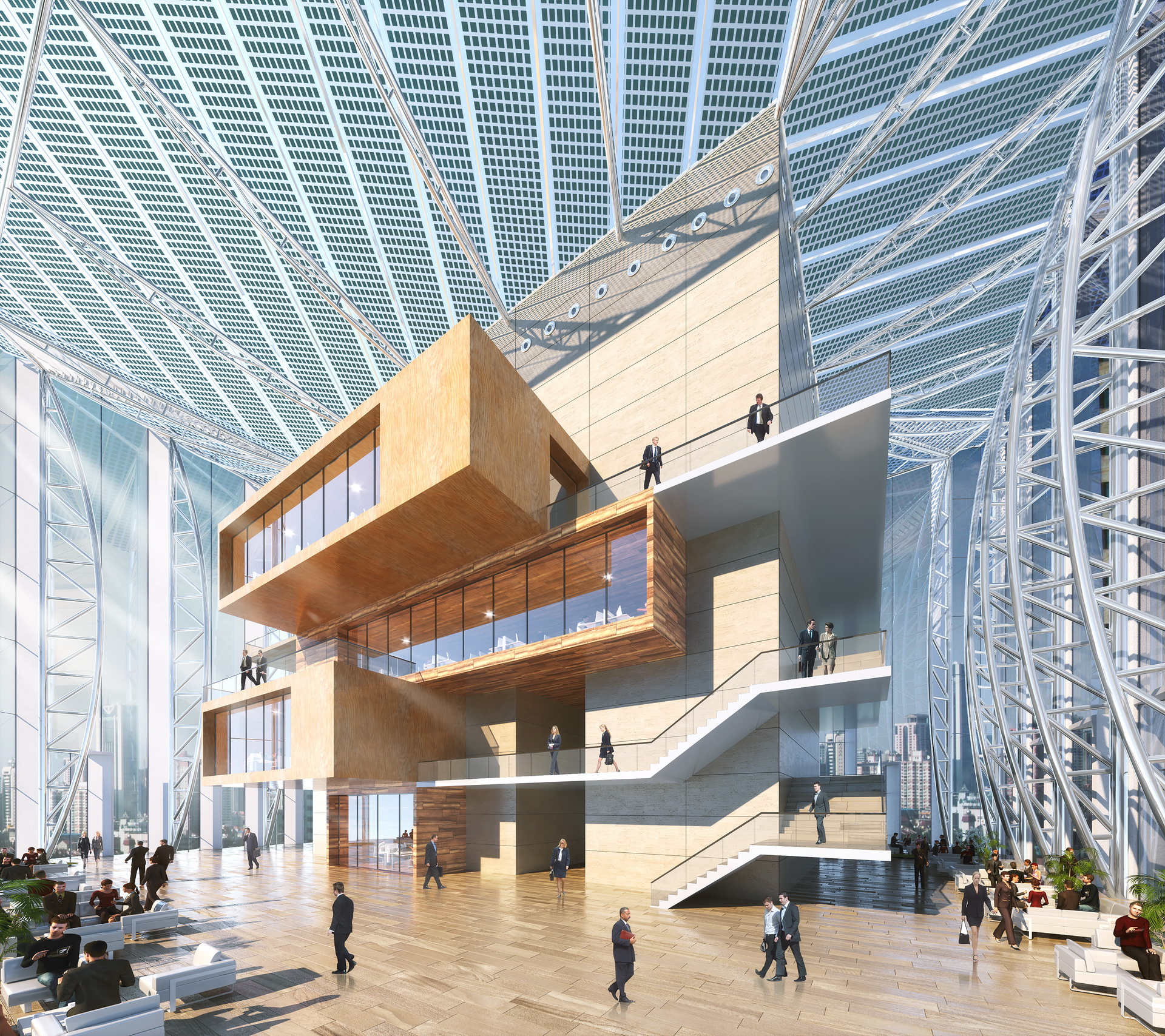 Inspired by the Mangrove tree, the tower features a succession of alternative opaque and transparent solid strips, like the flying Mangrove roots. Made of glass and aluminum, it is alternatively reflective, opaque, or transparent depending on the light orientation and the people’s view angle, creating a living facade that never feels the same. A solid feeling for the three-floor podium, composed of stone and glass, ensures the stability of the design. The main body’s facade smoothly features more glazing over the top, becoming the crown with stunning views of the Sea, creating a lantern feeling during the night. The crown is a four-floor height glazed space surrounding a sculptural arrangement of timber boxes along the core, housing executive meeting rooms and other VIP spaces.
