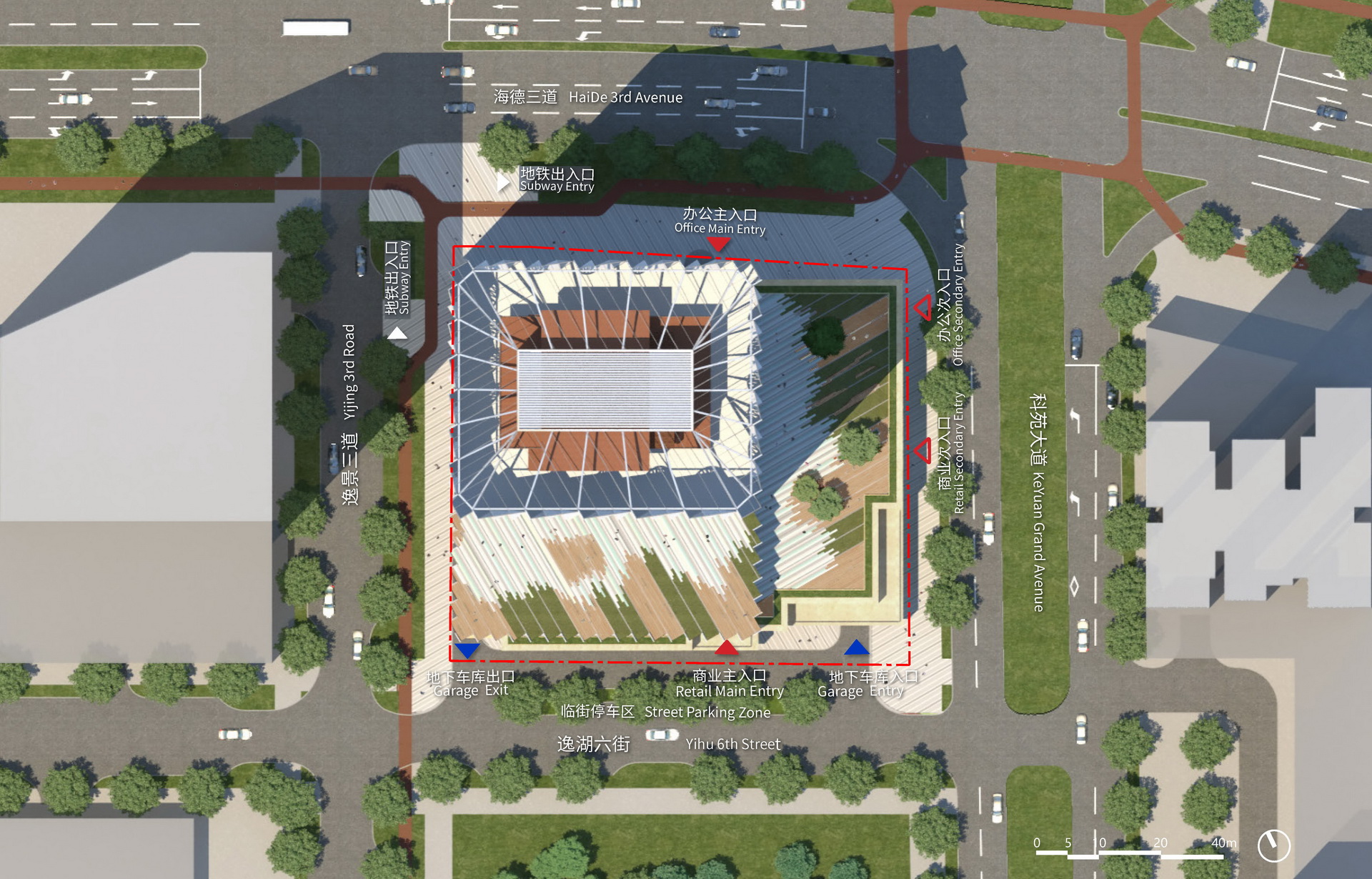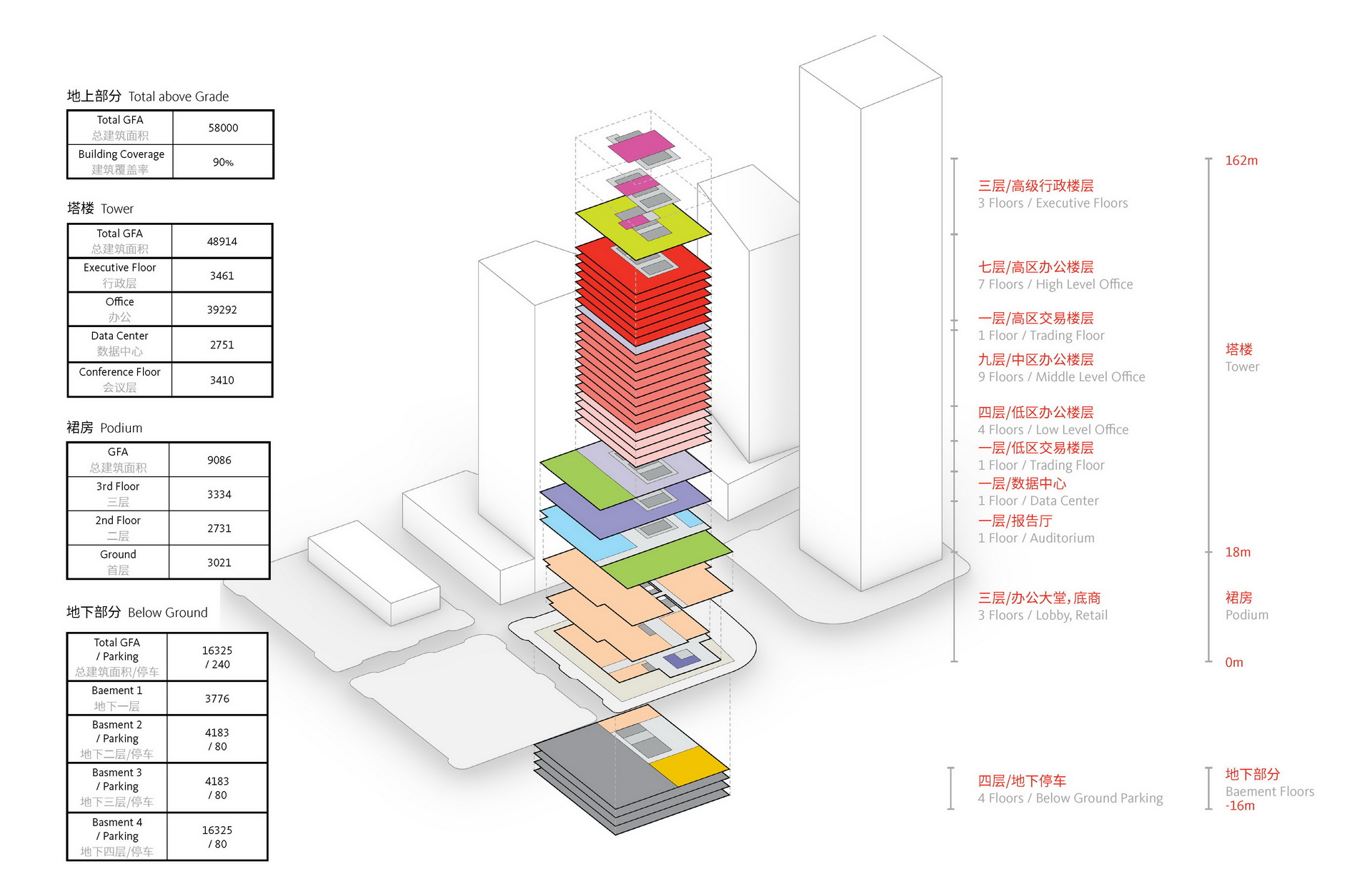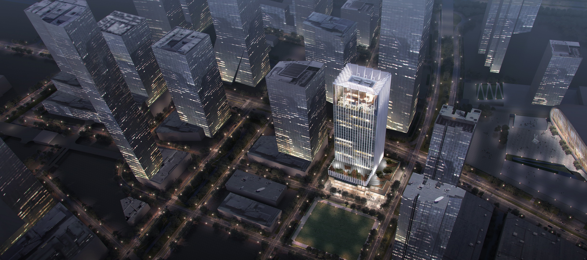 Inspired by the Mangrove tree, the tower features a succession of alternative opaque and transparent solid strips, like the flying Mangrove roots. Made of glass and aluminum, it is alternatively reflective, opaque, or transparent depending on the light orientation and the people’s view angle, creating a living facade that never feels the same. A solid feeling for the three-floor podium, composed of stone and glass, ensures the stability of the design. The main body’s facade smoothly features more glazing over the top, becoming the crown with stunning views of the Sea, creating a lantern feeling during the night. The crown is a four-floor height glazed space surrounding a sculptural arrangement of timber boxes along the core, housing executive meeting rooms and other VIP spaces.