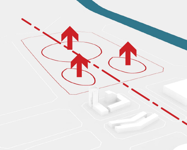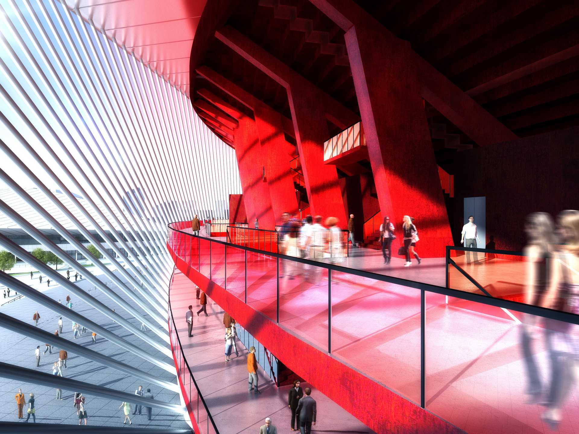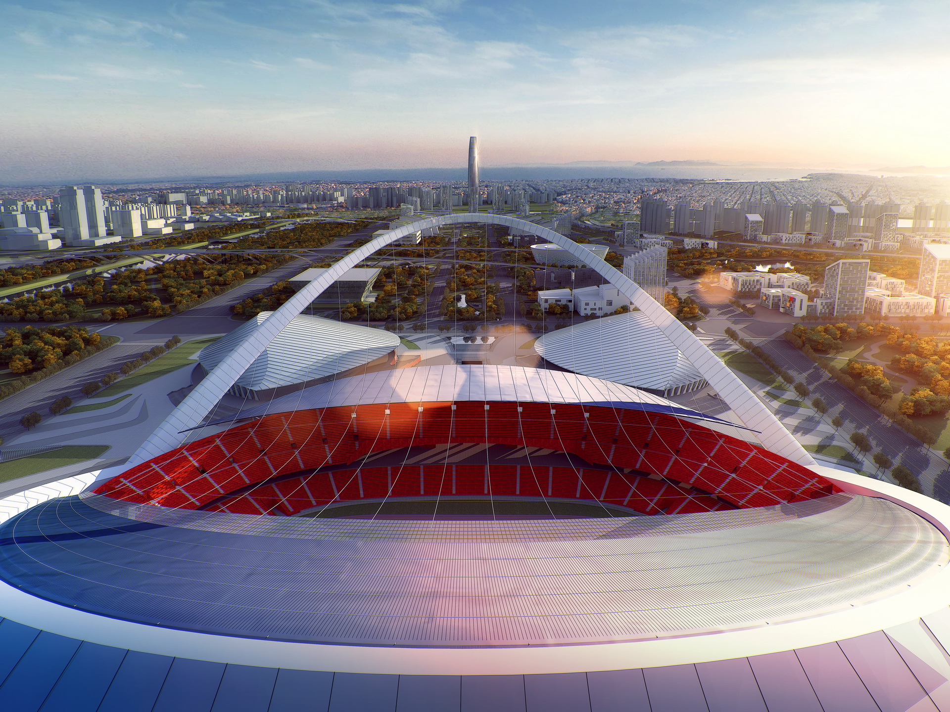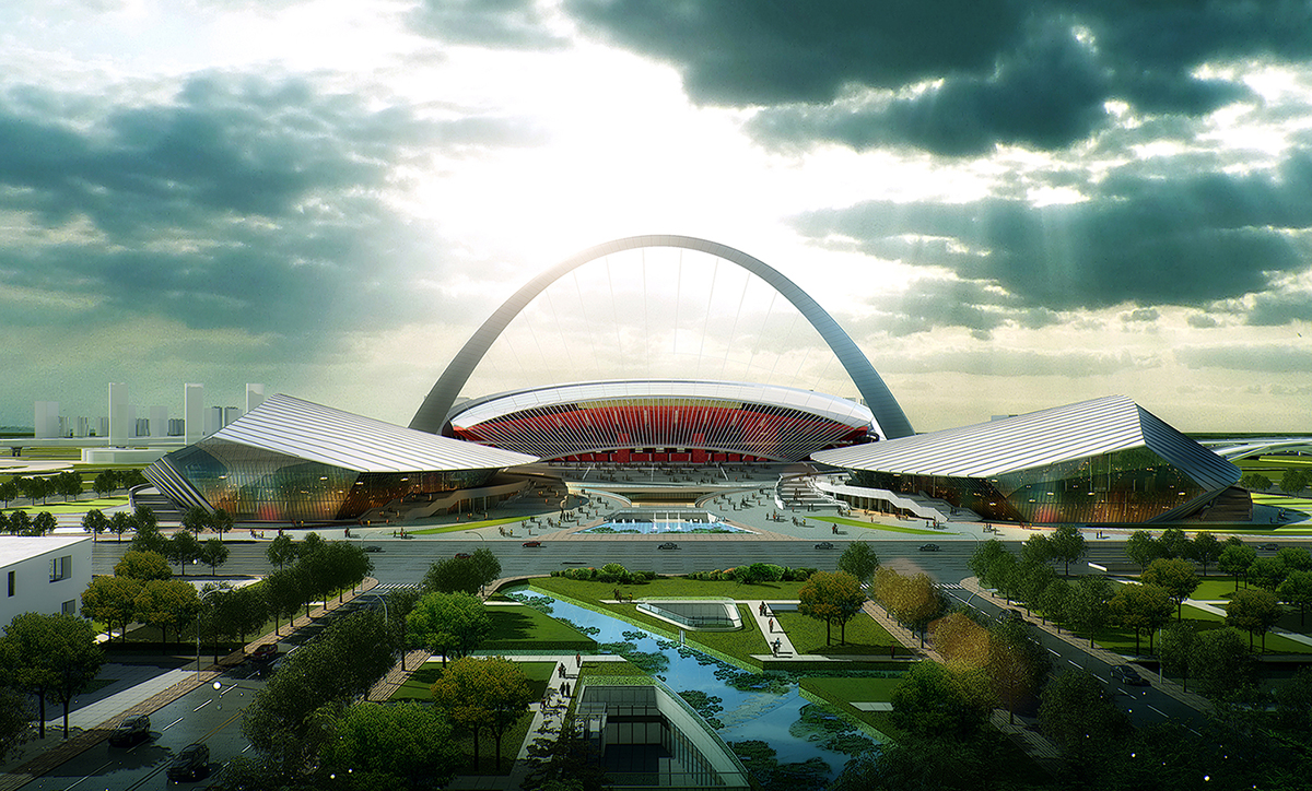 Placing the natatorium and the gymnasium on the northern and Southern corners of the site, we located the stadium to be a feature at the beginning of the urban axis. Featuring a unique facade with concrete tree-like columns on the back and an oblique arch and glazed facade on the front, I designed the stadium to open it to this urban axis. The gigantic front arch is a welcoming gate used as a structural element to hang the roof and the facade. I designed the gymnasium’s and natatorium’s facades to complement the stadium’s back facade. As my first stadium project, I redrew all the technical drawings of the bowl, gaining a comprehensive understanding of stadium drawings.