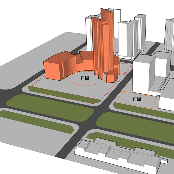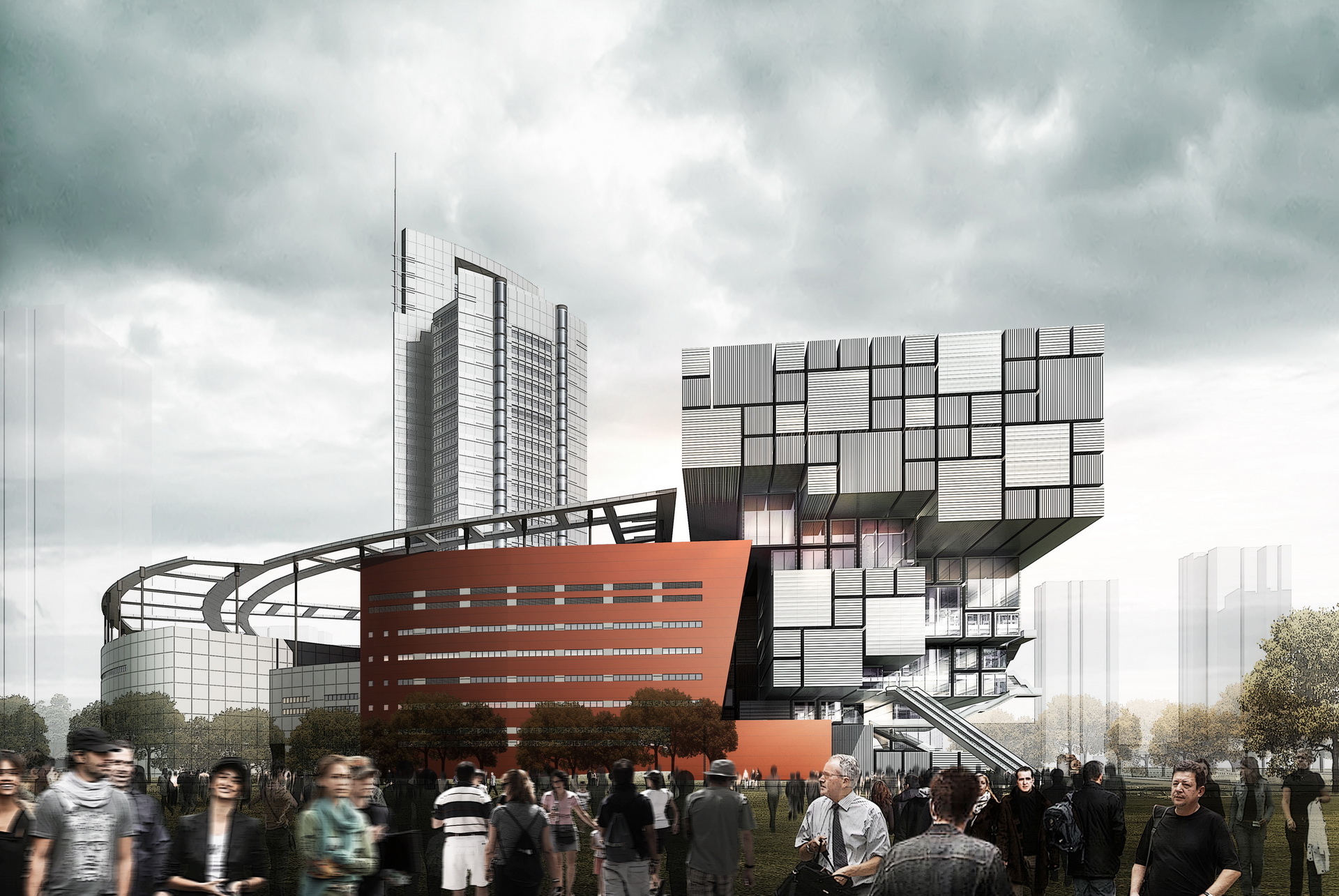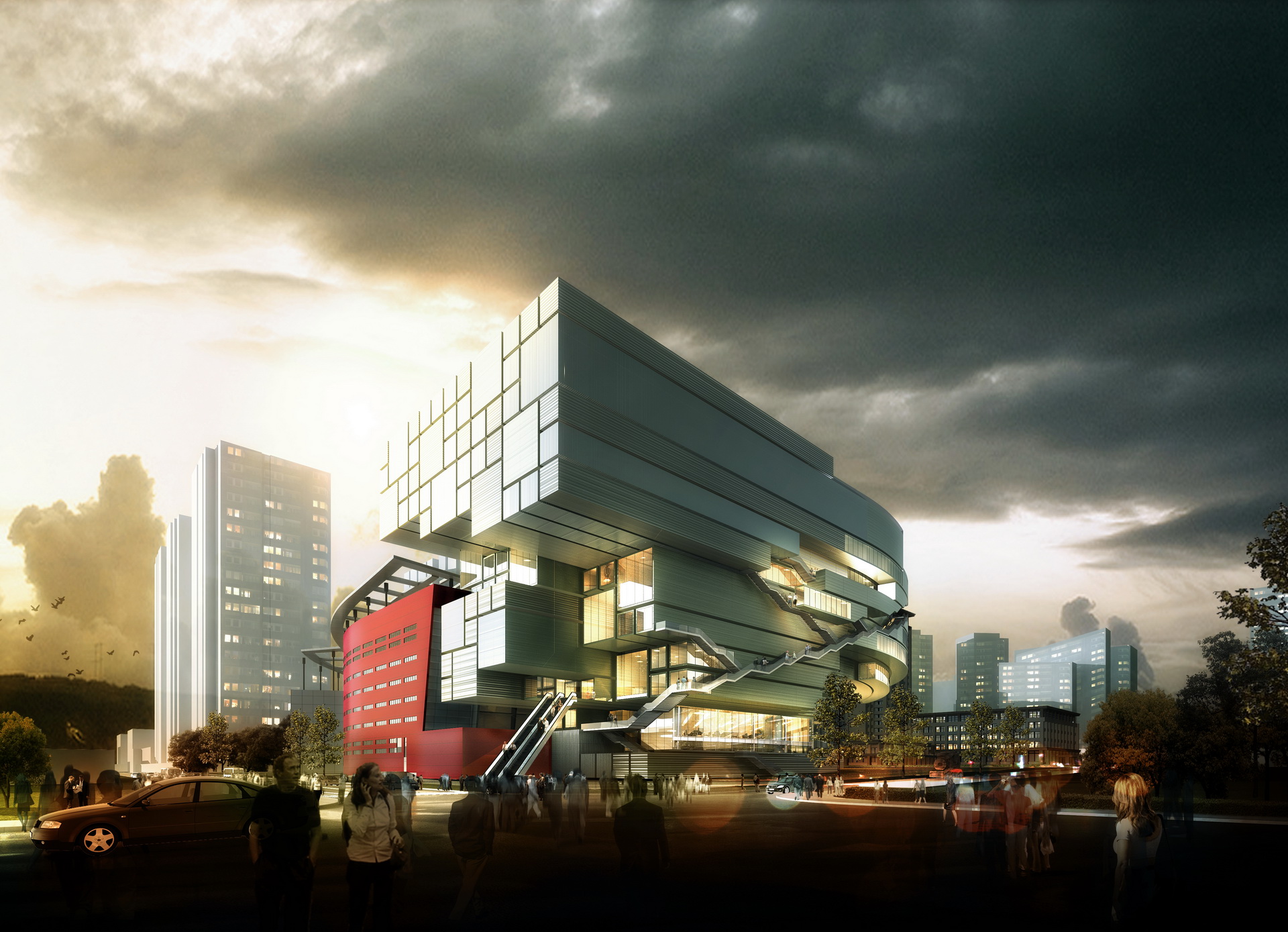Settled in a new district of the city, the site is already holding the headquarters of Chongqing Broadcasting Group, shaped like a half moon. We proposed the expansion to close it, creating a private central plaza and a strong facade along the main street. The design is inspired by the information flux, symbolized in the strips of the building. The South part of the building holds the studios and related functions, organized along a full-height atrium providing natural light. The North part holds the office spaces, connected with the existing building. I have done the competition stage with 2 interns, and after winning the competition, I kept on developing the schematic design and government report myself (3D model development, technical drawings, presentation file).