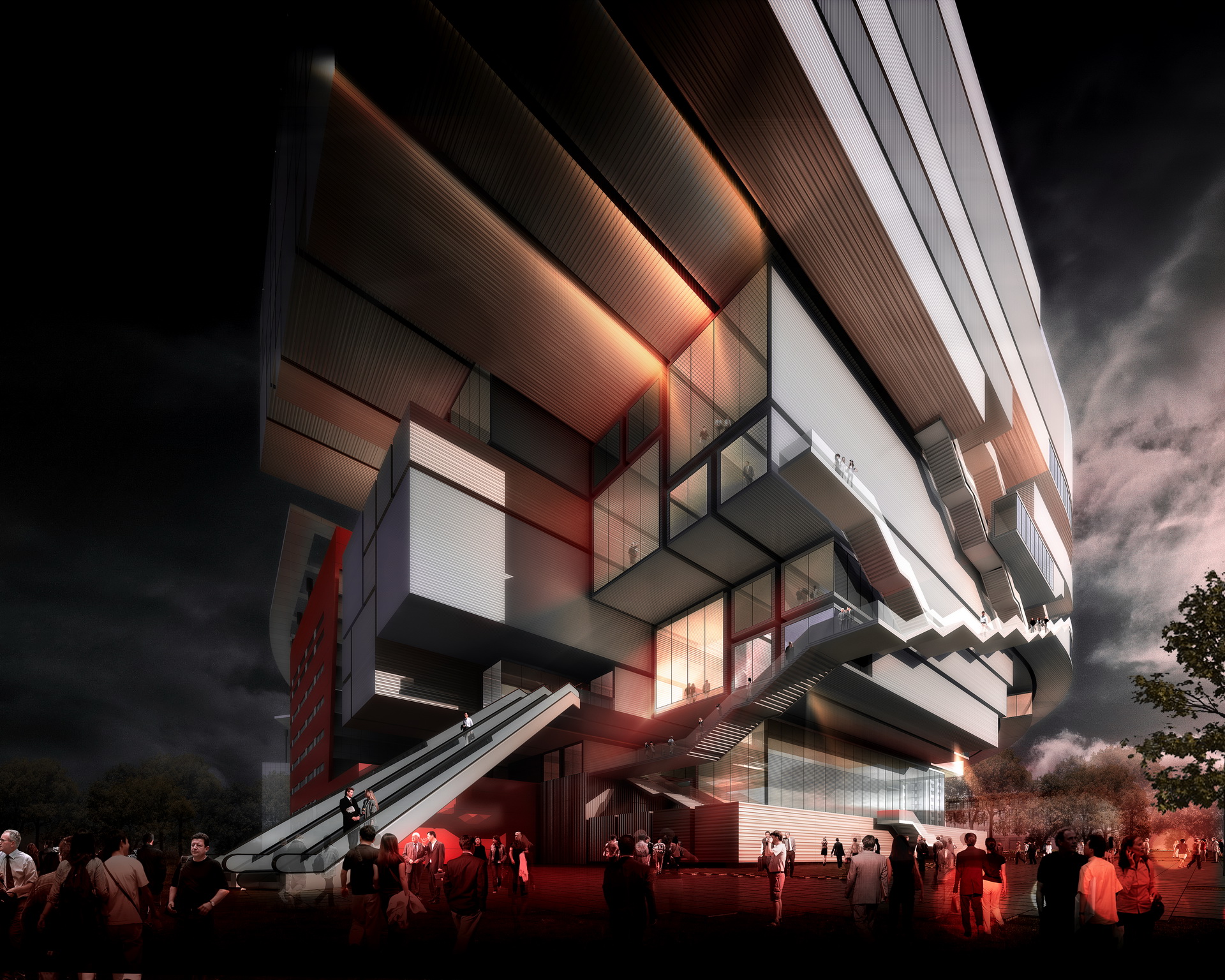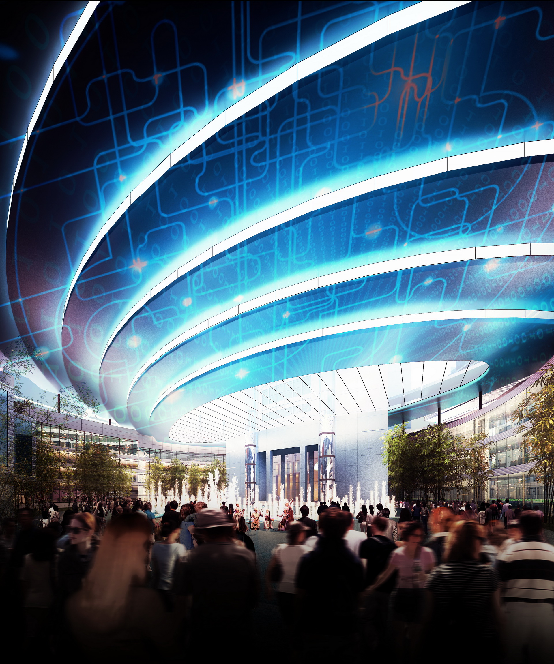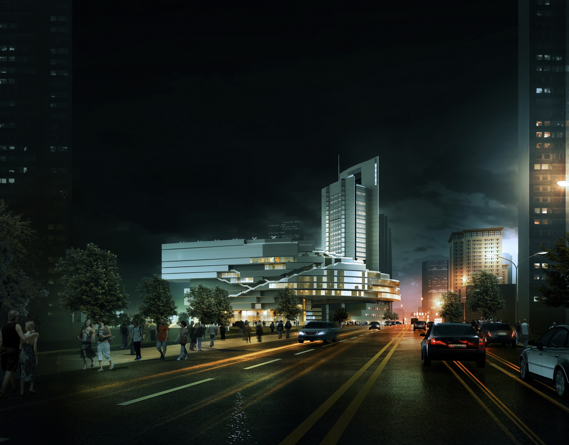 Settled in a new district of the city, the site is already holding the headquarters of Chongqing Broadcasting Group, shaped like a half moon. We proposed the expansion to close it, creating a private central plaza and a strong facade along the main street. The design is inspired by the information flux, symbolized in the strips of the building. The South part of the building holds the studios and related functions, organized along a full-height atrium providing natural light. The North part holds the office spaces, connected with the existing building. I have done the competition stage with 2 interns, and after winning the competition, I kept on developing the schematic design and government report myself (3D model development, technical drawings, presentation file).