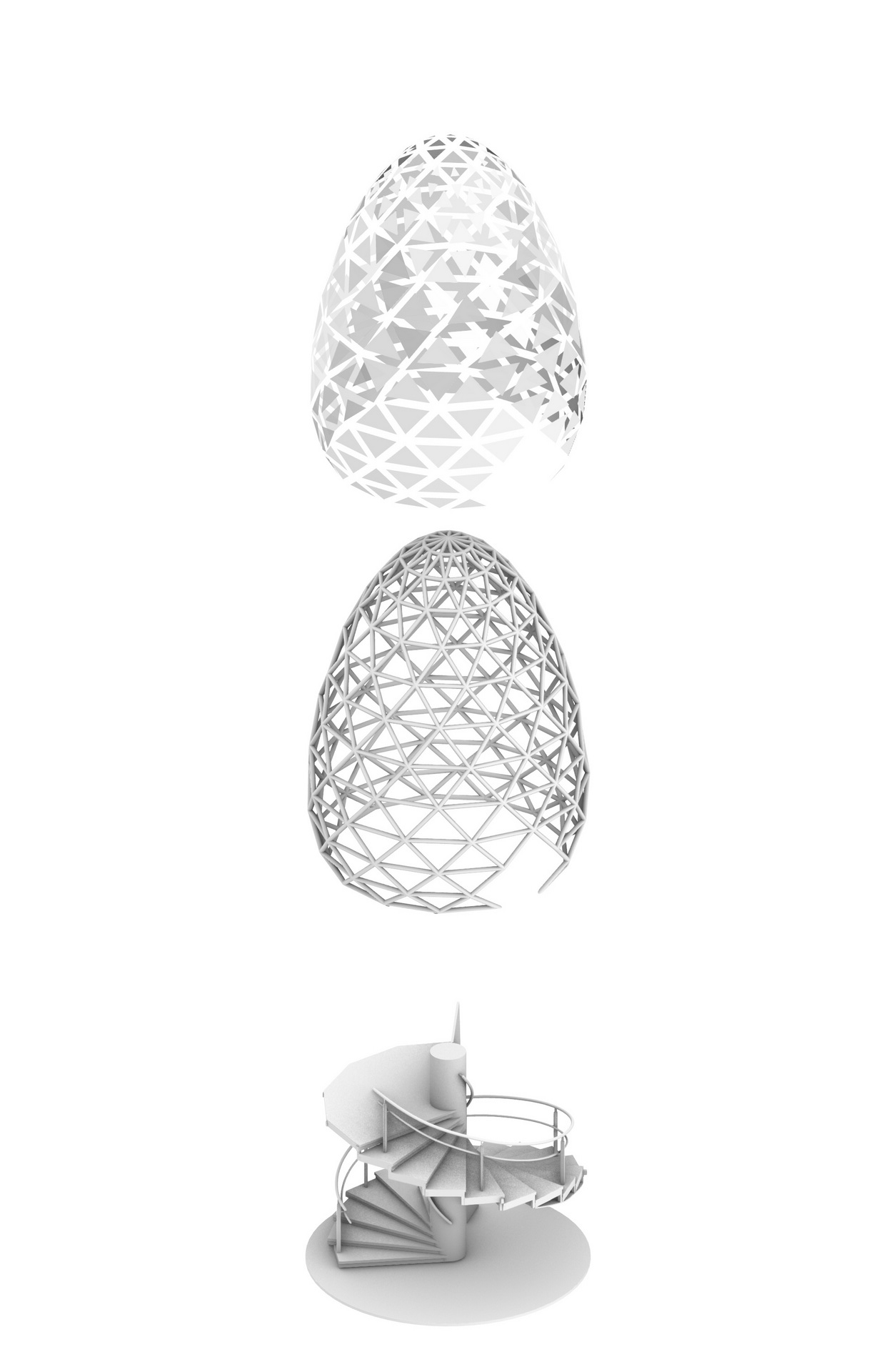 At the heart of a new residence, on top of a little hill, stands a white pine cone from which emerges a slider. A hut, a castle, a slider, a pinecone, an egg, this structure is created to excite children’s imagination. Structurally composed of a diagrid of tubular steel elements, its panels are perforated with 3 different patterns, allowing the light to enter inside, the children to see outside, and during the night turning this structure into a wonderful light nest.