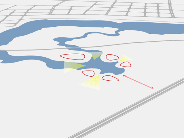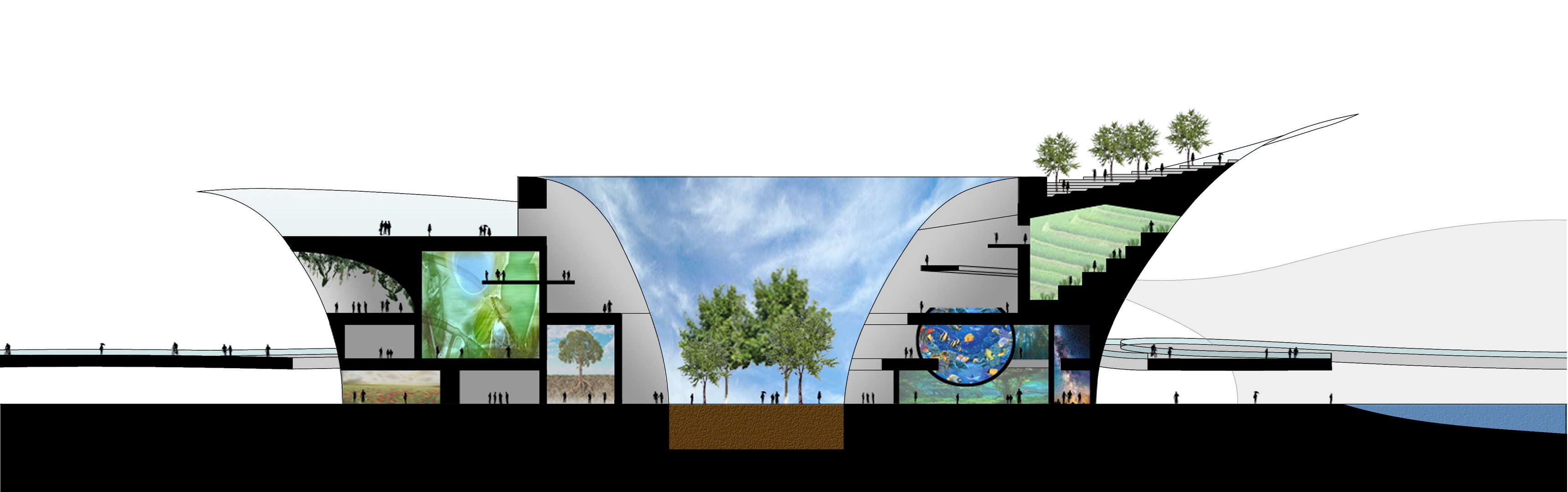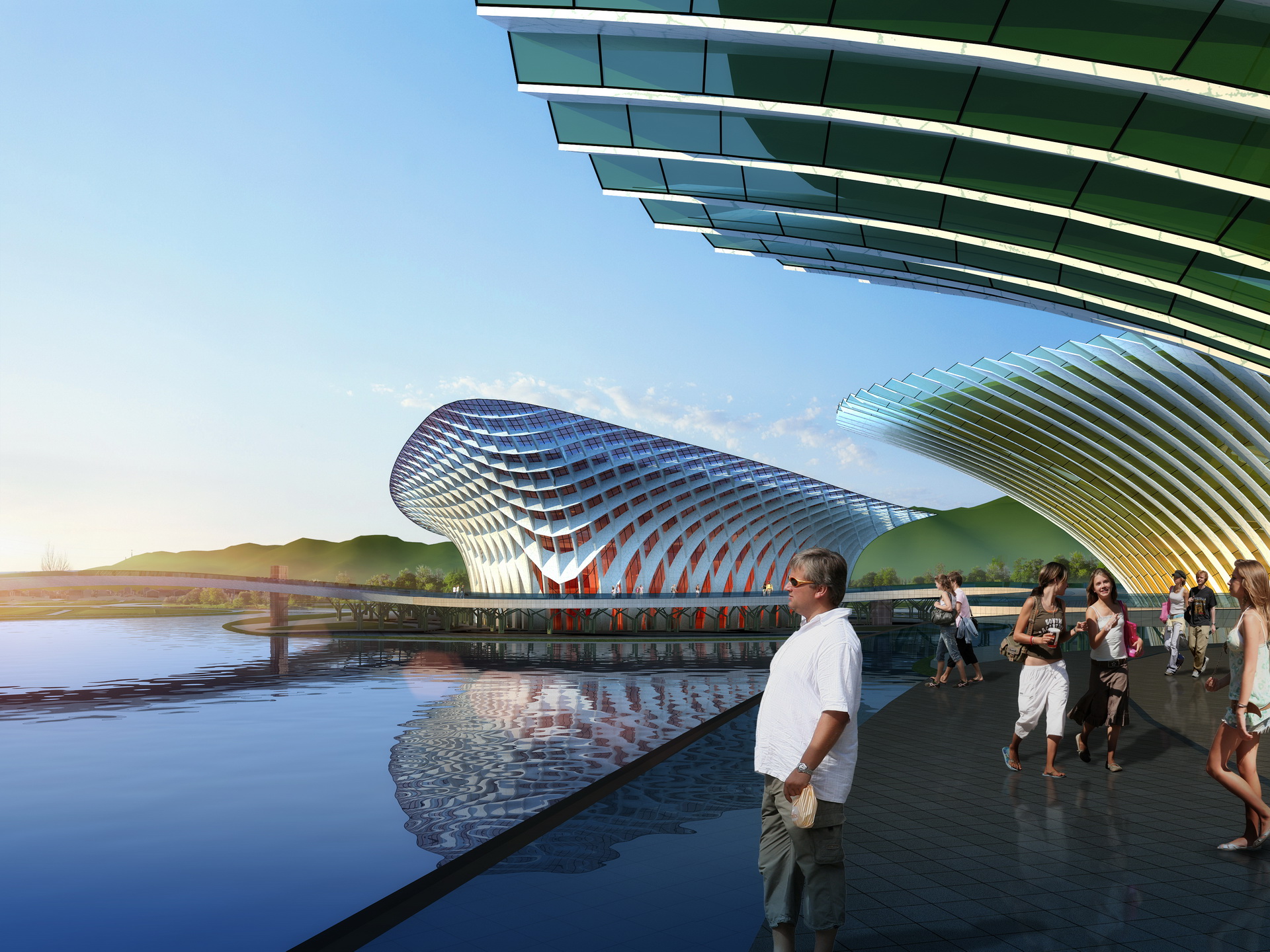 The Eastern axis is the most urban one and holds the main structures of the park, including the five main pavilions and entrance gates, all designed to resemble flowers with elegant natural curves. As a Flower expo, we decided to group the main pavilions in a central core, freeing up the remaining space for plantations and botanical gardens.