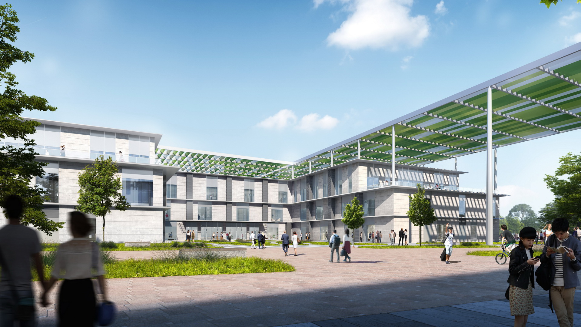 To unify the different clusters and to blend the campus into the site, a green canopy made of louvers and solar panels was created. The result is a campus that is both modern and lyrical, with a design that seamlessly integrates with nature.