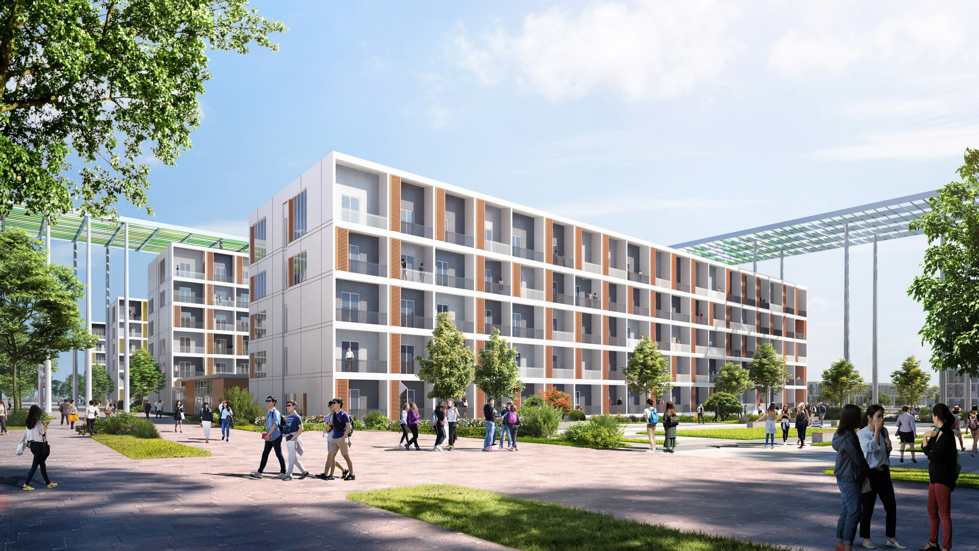 The remaining four areas are dedicated to the four core functions of the school, namely the academic center, dormitories, sports center, and supporting facilities. The buildings’ facades are designed to ensure maximum natural ventilation and optimal utilization of orientation, thereby reducing the need for ventilation and heating while maintaining a modern yet simple look.
